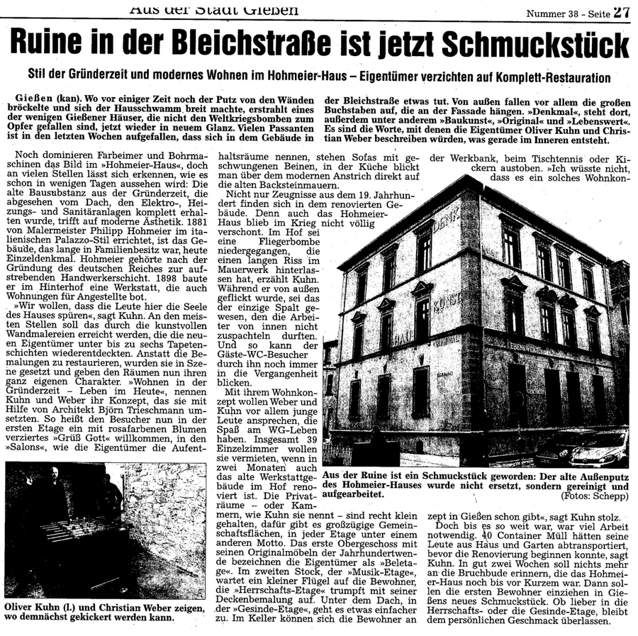 Das Anwesen – jahrelang „hässliches“ Ärgernis in der Gießener Innenstad – hat schon während der Renovierungszeit zahlreich Bürger veranlasst, spontan das Gebäude zu betreten und Genugtuung über die neue Fassade beispielsweise zum Ausdruck zu bringen. Auch Dozenten der TH und Architekten fanden sich einfach so im Gebäude ein, weil die Fassadenbeschriftung dazu förmlich eingeladen hat. Hier erhielten wir höchste Anerkennung für das Geleistete.