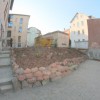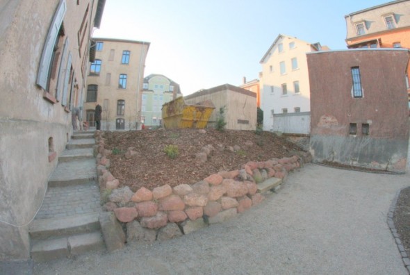 - Original-Kopfsteinpflaster auf Gehwegen und im Innenhof historische Pflanzkübel