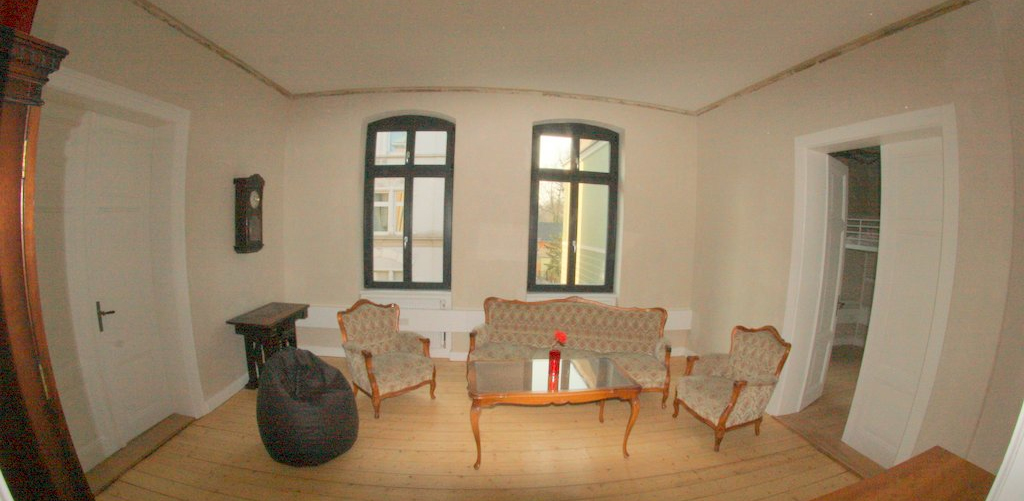 Salon mit Original-Möbeln der Jahrhundertwende (3er Sofa, Sessel, Beistelltisch, Pendeluhr, Bücherschrank und diversen weiteren Einrichtungsgegenständen) und großer Flachbild-TV